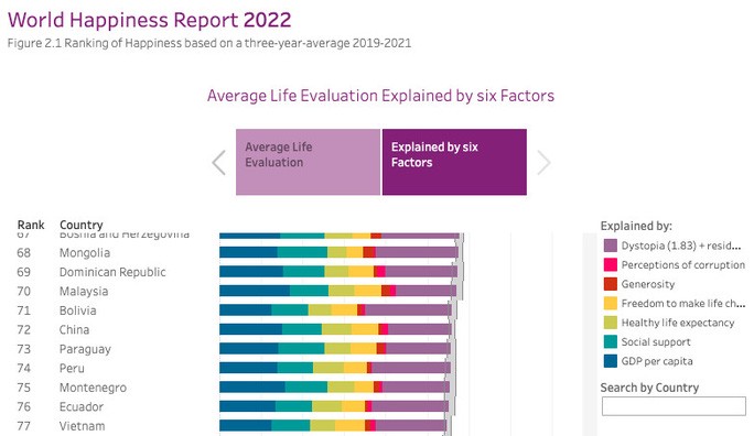 Việt Nam xếp hạng 77 trong số các quốc gia hạnh phúc nhất thế giới năm 20220. Ảnh: Mạng lưới Giải pháp Phát triển Bền vững của Liên Hợp Quốc.