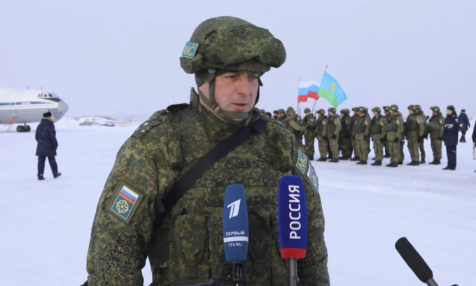 Đại tá Sergei Sukharev xuất hiện trên TV khi dẫn quân trở về từ Kazakhstan hồi tháng 1. Ảnh: GTRK Kostroma.