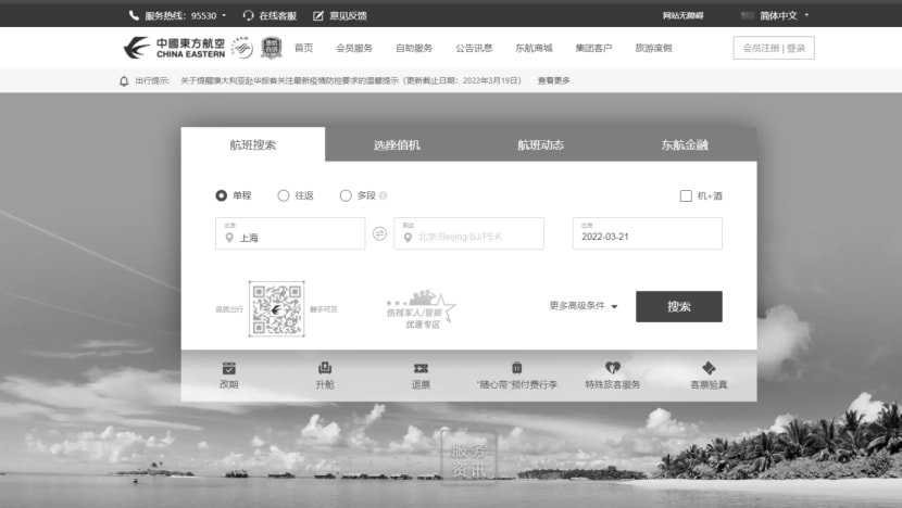 Trang web của hãng hàng không China Eastern Airlines hiện hiển thị 2 màu đen và trắng - hình thức mà các hãng hàng không thường phản ứng trước một vụ tai nạn để thể hiện sự tôn trọng đối với các nạn nhân.