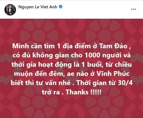 Mới đây, diễn viên Việt Anh cho biết anh cần một địa điểm ở Tam Đảo để chuẩn bị bữa tiệc cho 1000 người. Ngay lập tức, nhiều người hỏi Việt Anh về việc có phải anh sắp chuẩn bị cưới lần 2 hay không.