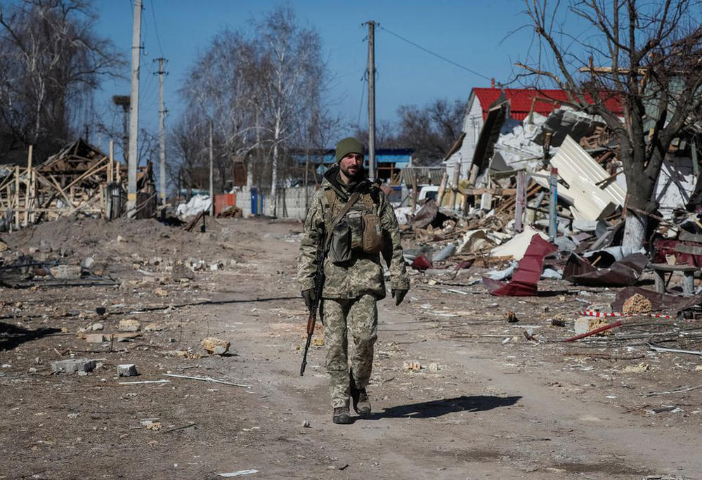 Một binh lính Quân đội Ukraine tại ngôi làng bị phá hủy ở chiến tuyến ở miền đông Kyiv, Ukraine ngày 21 tháng 3 năm 2022. Ảnh: Reuters