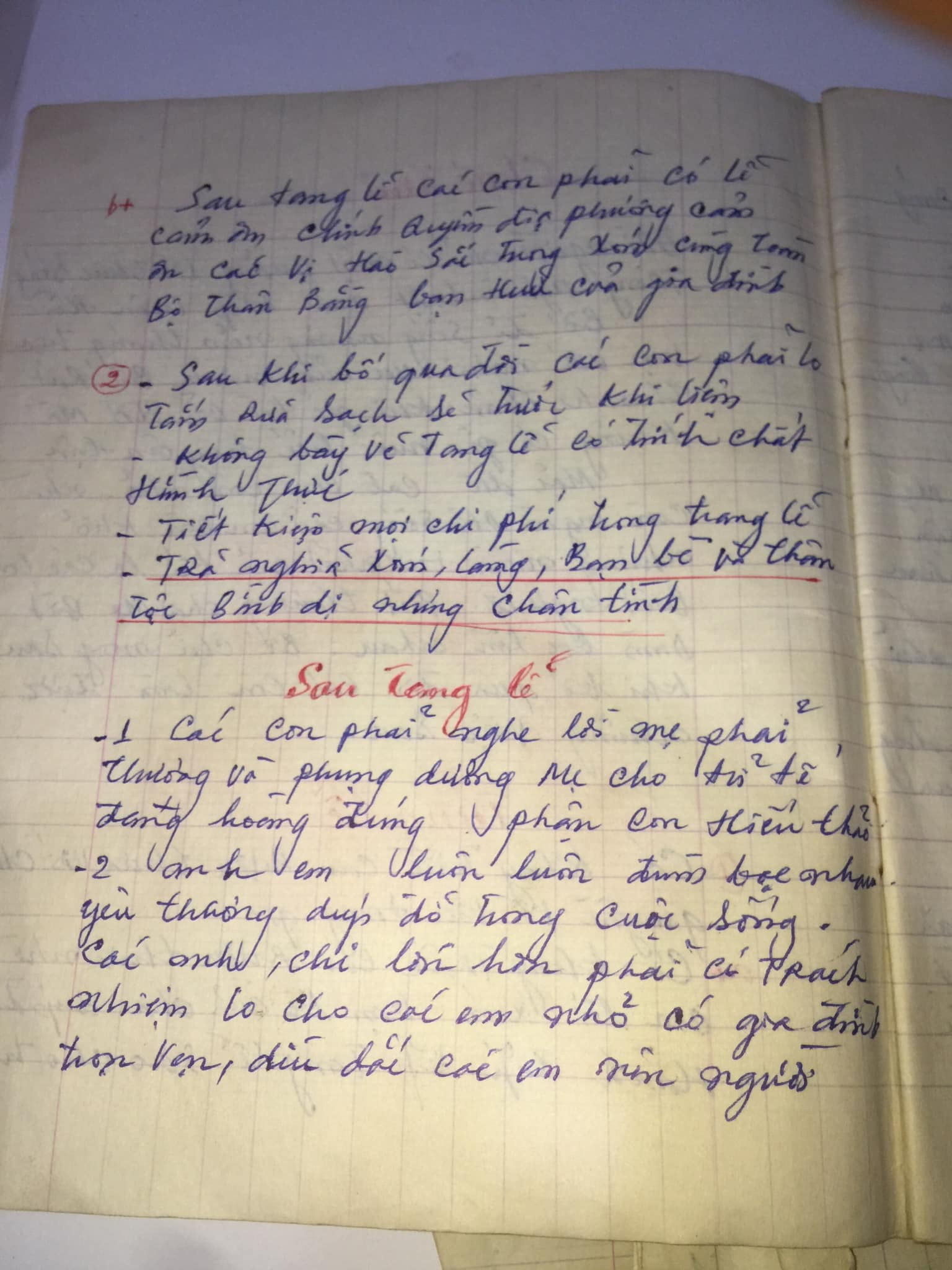 Có lẽ đã dự liệu trước được sự ra đi của bản thân, người cha cũng tỉ mỉ liệt kê rằng tang lễ cần chuẩn bị những gì, tổ chức tiết kiệm và nhớ trả nghĩa hàng xóm, người thân.