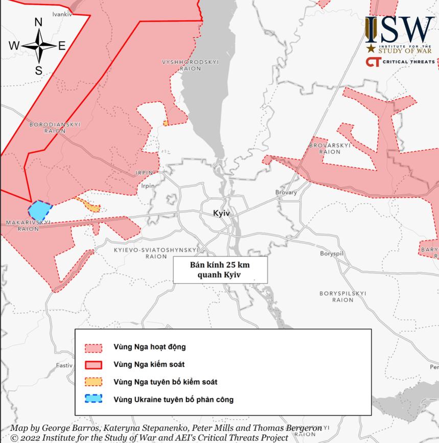 Viện Nghiên cứu Chiến tranh (ISW), trung tâm nghiên cứu có trụ sở tại Mỹ, đưa ra nhận định tương tự. Hôm 22/3, ISW chỉ ra lực lượng Nga ở Tây Bắc và Đông Bắc Kyiv tiếp tục pháo kích thành phố và củng cố vị trí phòng ngự, nhưng không tổ chức cuộc tấn công lớn nào.