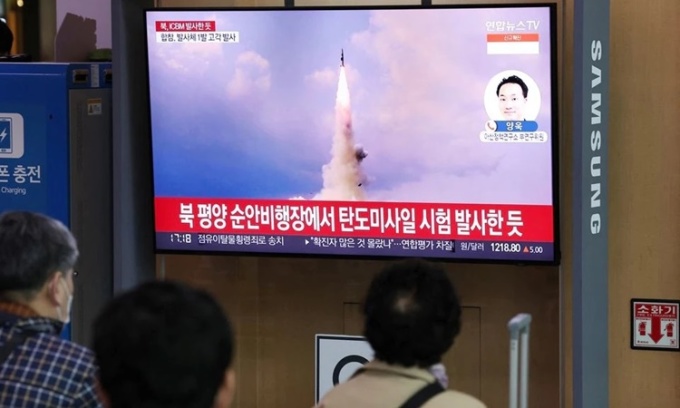 Người dân ở thủ đô Seoul, Hàn Quốc xem bản tin về vụ thử tên lửa đạn đạo xuyên lục địa (ICBM) của Triều Tiên ngày 24/3. Ảnh: Reuters.