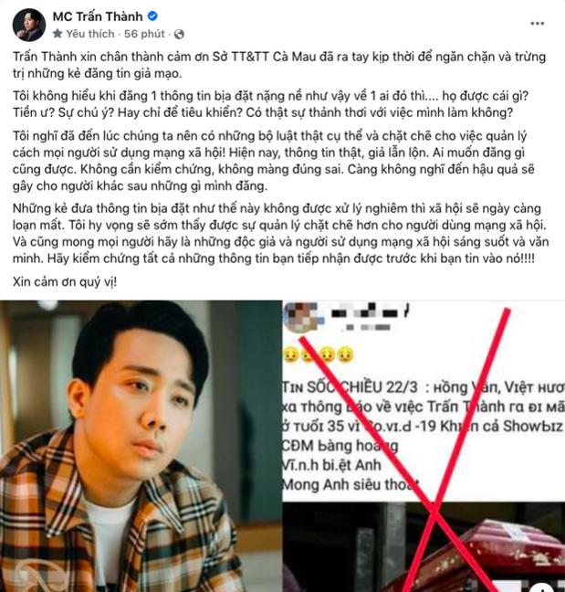 Vừa qua, Trấn Thành bất ngờ bị 1 tài khoản tung tin thất thiệt đã qua đời vì Covid-19, khiến không ít khán giả cảm thấy hoang mang. Tuy nhiên, sau khi điều tra và xác định thông tin trên là bịa đặt, Sở TT&TT tỉnh Cà Mau yêu cầu gỡ bỏ và thanh tra xử phạt người đăng.
