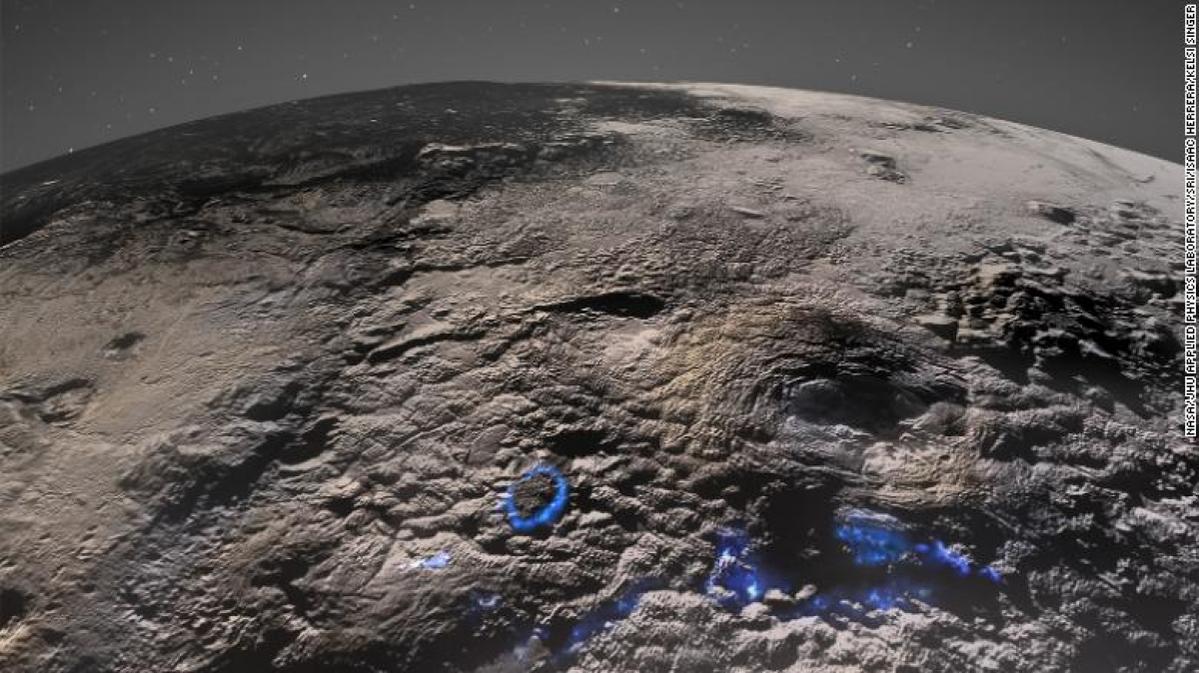 Các núi lửa băng có thể được thấy trong bức ảnh được chụp bởi tàu vũ trụ New Horizons của NASA. Những điểm đánh dấu màu xanh cho thấy những hoạt động trước đây của núi lửa băng có thể đã từng diễn ra. Ảnh: CNN