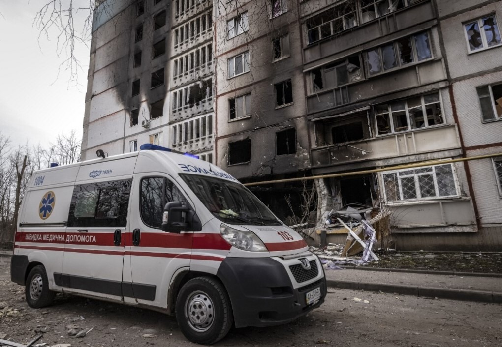 Xe cứu thương gần một tòa nhà thiệt hại do giao tranh tại Kharkov, Ukraine, ngày 2/4. Ảnh: AFP.