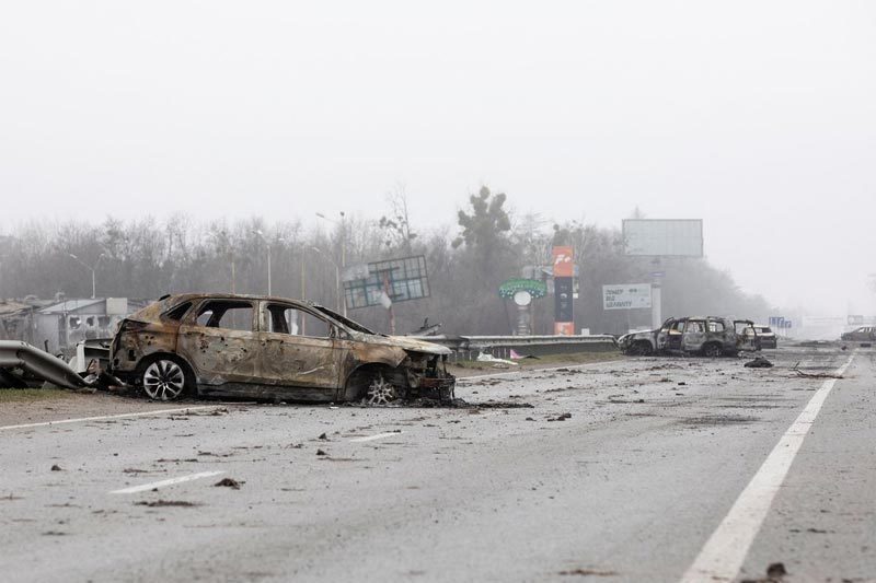Các xe hơi bị phá hủy trên một đường cao tốc cách thủ đô Kiev của Ukraine khoảng 20km. Ảnh: Reuters