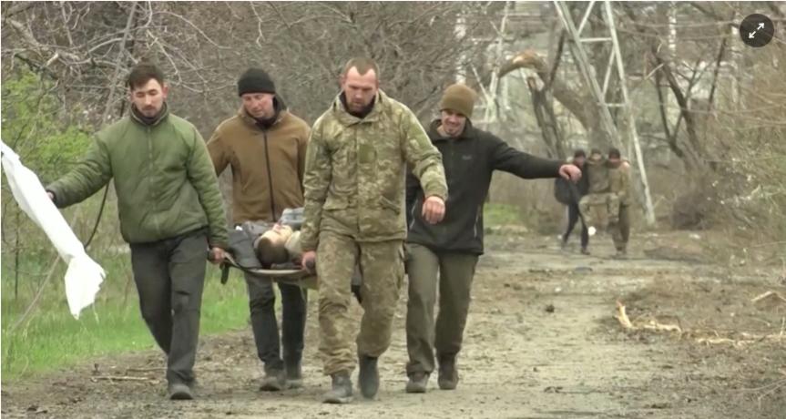Phía Nga cũng cho biết 151 binh sĩ Ukraine bị thương đã được điều trị tại chỗ và đưa tới bệnh viện ở Mariupol. Trong ảnh, một nhóm binh sĩ Ukraine vận chuyển một đồng đội bị thương bằng cáng sau khi đầu hàng.