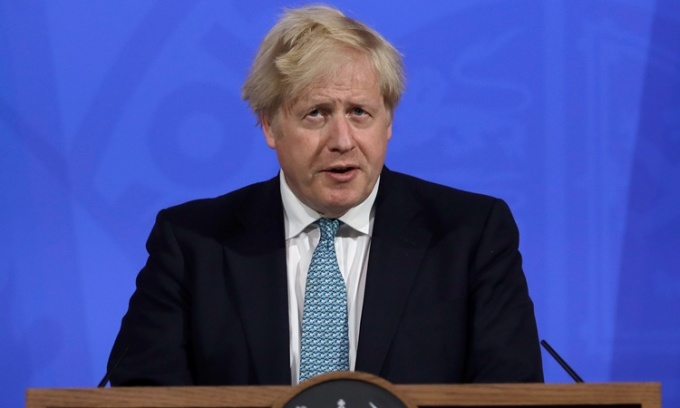 Thủ tướng Anh Boris Johnson phát biểu tại một cuộc họp báo ở London hồi năm ngoái. Ảnh: Reuters.