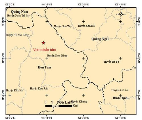 Đặc biệt, vào lúc 6h21 phút sáng nay (16/4), tại huyện Kon Plong tiếp tục xảy ra một trận động đất có độ lớn 3.3 richter xảy ra tại vị trí có tọa độ (14.856 độ vĩ Bắc, 108.230 độ kinh Đông), với độ sâu chấn tiêu khoảng 8,5 km.TS Nguyễn Xuân Anh, Viện trưởng Viện Vật lý Địa cầu cho biết, khu vực Kon Tum nói chung và huyện Kon Plông nói riêng thuộc đới đứt gãy nhỏ. Các nghiên cứu trước chỉ ra rằng các trận động đất tại khu vực này độ lớn không quá 5 richter.