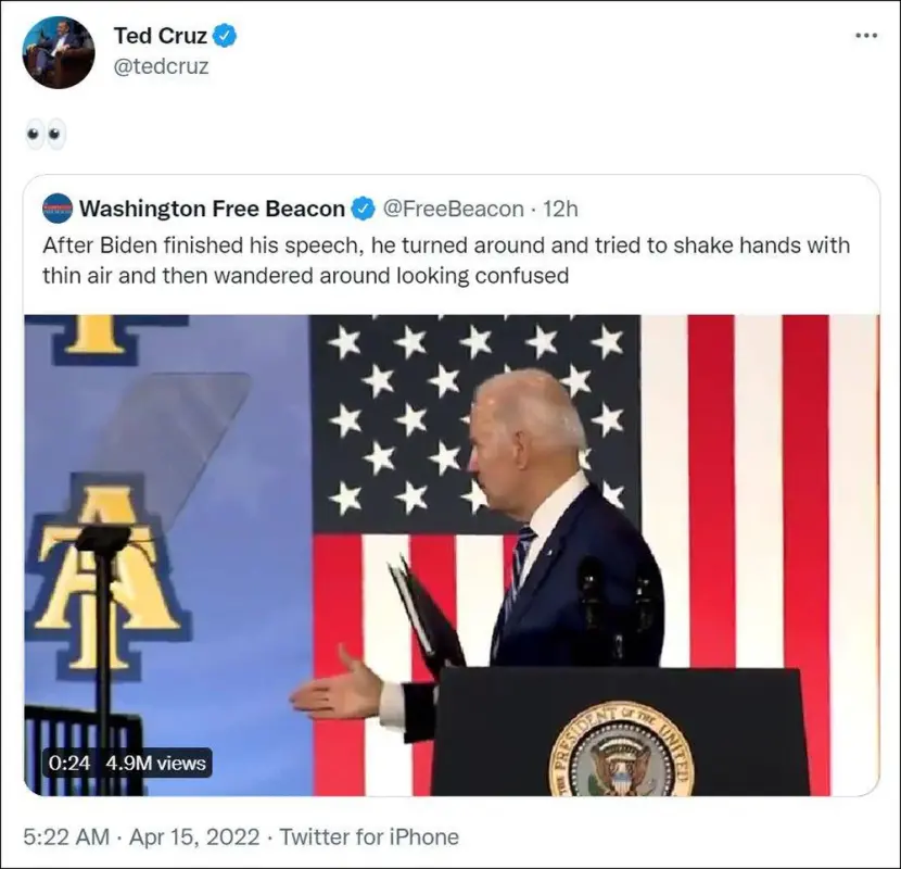 Video về sự kiện này cho thấy, sau khi kết thúc bài phát biểu của mình bằng câu "Chúa phù hộ cho các bạn", Tổng thống Biden cầm tài liệu lên và quay sang bên phải, chuẩn bị bước xuống. Nhưng lúc này, ông Biden dường như muốn nói điều gì đó và đưa tay ra để bắt tay. Tuy nhiên, bên cạnh ông không hề có ai mà chỉ là một khoảng không.