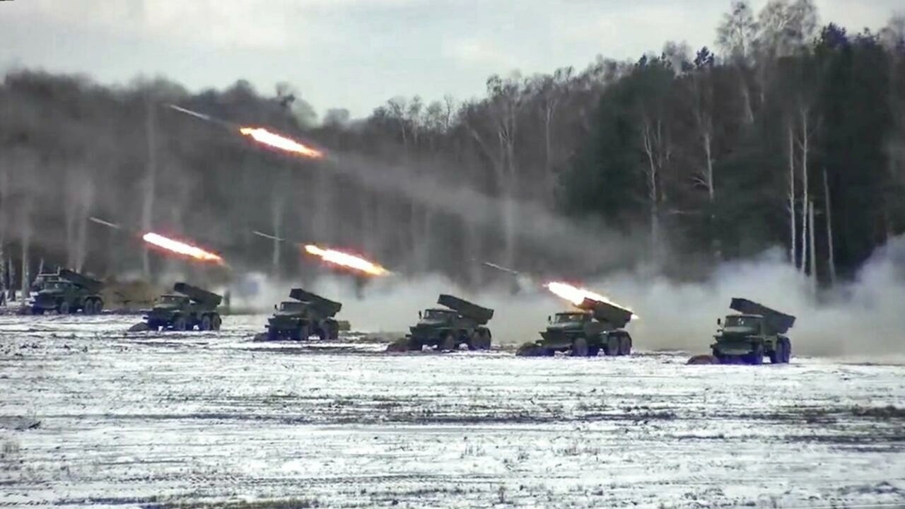 Ảnh trích từ video bộ Quốc Pḥng Nga công bố ngày 04/02/2022 : Tên lửa khai hỏa trong cuộc tập trận chung của Belarus và Nga tại trường bắn Brestsky, Belarus. AP