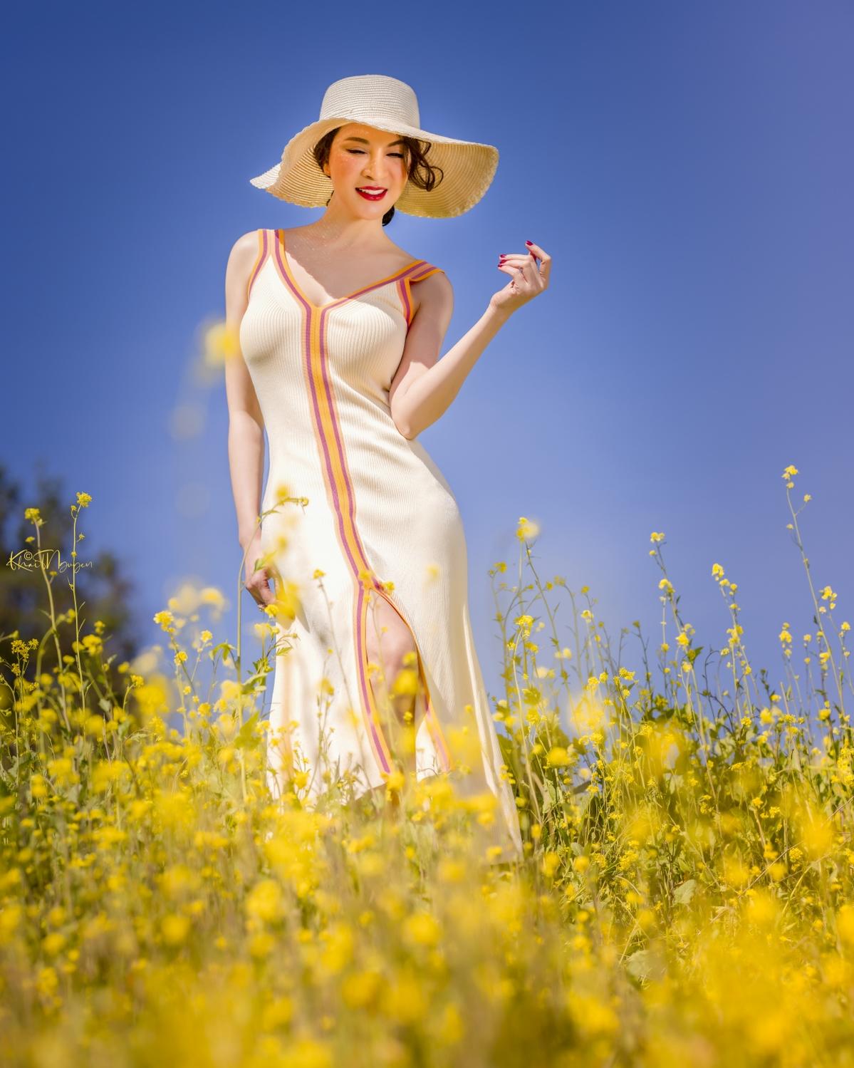 Dạo chơi giữa thiên nhiên, Thanh Mai khéo chọn những trang phục giúp tôn vóc dáng. Cô diện màu trắng để nổi bật trên nền hoa vàng và ưu ái những chiếc đầm bay bổng, duyên dáng để phù hợp bối cảnh tràn đầy vẻ lãng mạn. “Nữ hoàng ảnh lịch” cho biết, cô không đưa ê-kíp đi Mỹ nên tự làm hầu hết các công đoạn như trang điểm, tết tóc, chuẩn bị quần áo… Tuy vậy, cô được khen diện mạo chỉn chu, xinh đẹp nổi bật nhờ nhan sắc tự nhiên có sẵn, không cần tô điểm cầu kỳ.
