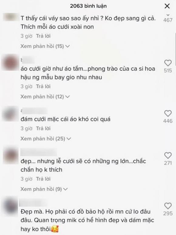 Thế nhưng, một số khác lại chê bai chiếc đầm cưới mà cô diện để đón khách mời và chụp ảnh quá táo bạo và có những đường cắt xẻ nhức mắt, không phù hợp với ngày trọng đại. Netizen đưa ra quan điểm rằng bữa tiệc này c̣n có sự xuất hiện của bố mẹ và hai bên gia đ́nh nên sự gợi cảm quá đà sẽ mang đến sự phản cảm.