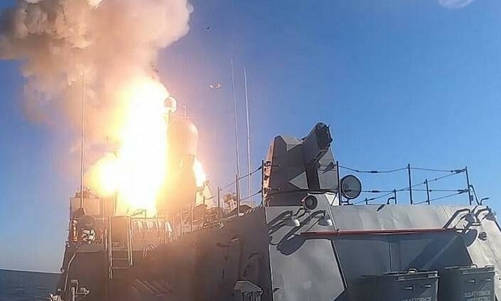 Tàu chiến Nga phóng tên lửa hành trình Kalibr tập kích kho vũ khí ở tỉnh Zaporizhzhia, Ukraine hôm 26/4. Video: Bộ Quốc phòng Nga.