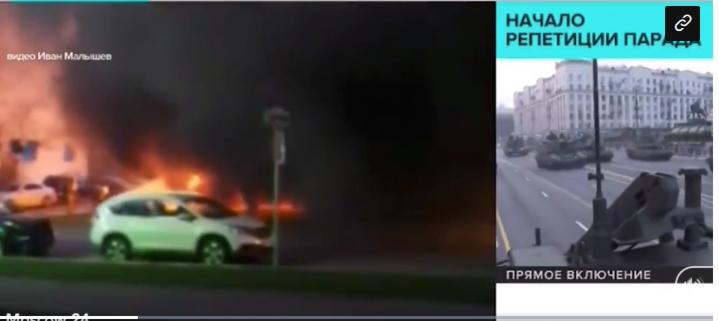 Người dùng Twitter @igorsushko cũng đăng một đoạn clip về vụ cháy, bên dưới chú thích: "7 chiếc xe hơi bị thiêu rụi ở Moscow".
