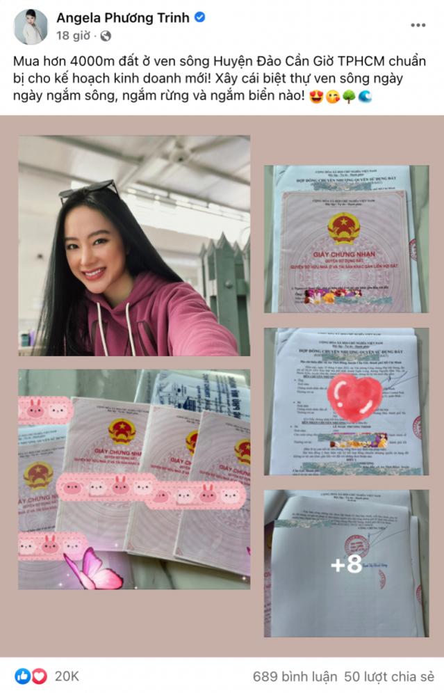 Mới đây, Angela Phương Trinh đã bất ngờ tiết lộ mua hơn 4000 mét đất ở ven sông để xây biệt thự và kinh doanh. Kèm theo đó là loạt sổ hồng “căng đét”: "Mua hơn 4000m đất ở ven sông huyện đảo Cần Giờ TP.HCM chuẩn bị cho kế hoạch kinh doanh mới. Xây cái biệt thự ven sông ngày ngày ngắm sông, ngắm rừng và ngắm biển nào". Không hề kém cạnh Cao Thái Sơn, Angela Phương Trinh cũng chuẩn bị lấn sân vào con đường bất động sản.