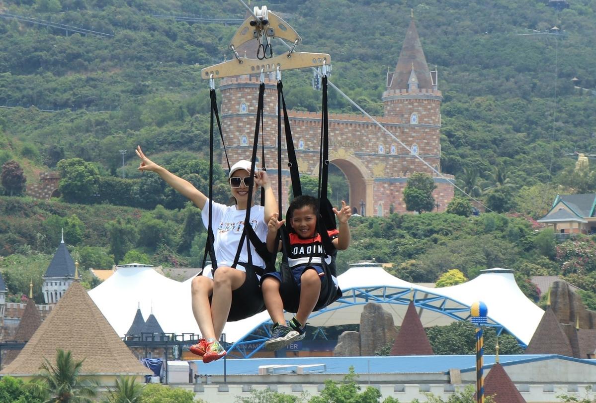Hoa hậu cho biết sau khi quen với đường trượt dài 880 m, Nu không còn sợ hãi, thay vào đó hào hứng, cùng mẹ tạo dáng để bố chụp ảnh.