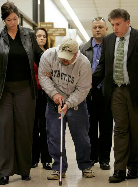 Ronald Dominique phải chống nạng khi bị áp giải từ tòa án đến nhà tù năm 2006. Ảnh: The Courier