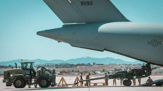 Lựu pháo M777 được đưa lên máy bay vận tải C-17 Globemaster III của Không quân Mỹ tại căn cứ ở California hồi tháng 4/2022. Ảnh: AFP
