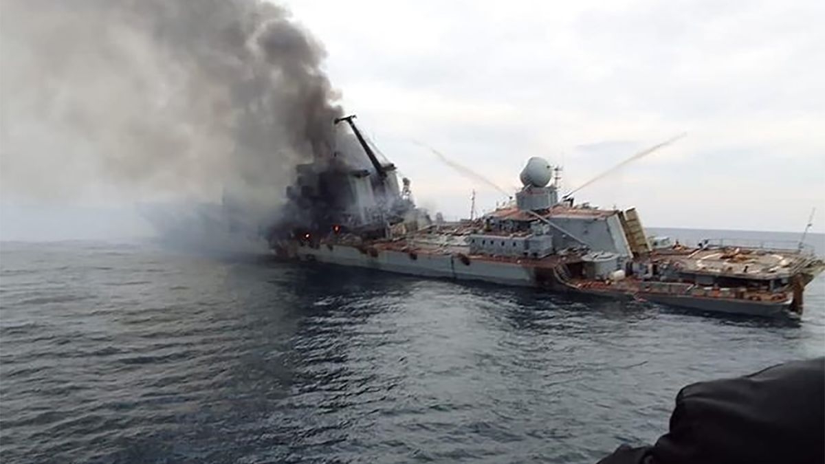 Hình ảnh soái hạm Moskva của Nga bị hư hỏng nghiệm trọng, vài giờ trước khi bị chìm ở Biển Đen ngày 18/4. Ảnh: CNN