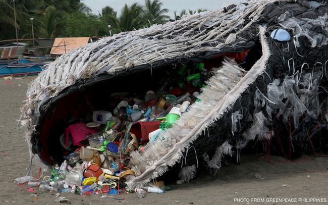 Một mô hình cá voi được dựng lên ở một bãi biển thuộc tỉnh Cavite, phía Nam vịnh Manila (Philippines) để tuyên truyền về tình trạng ô nhiễm môi trường biển và tác động của rác thải nhựa.