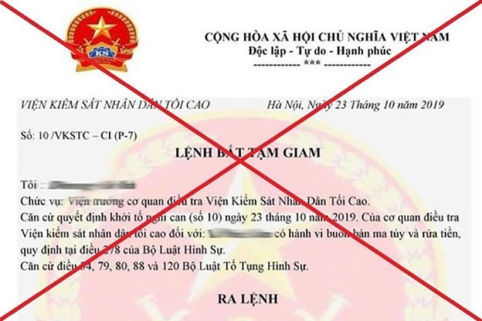 Một lệnh bắt do kẻ xấu làm giả để hù doạ nạn nhân. Ảnh: Công an cung cấp.