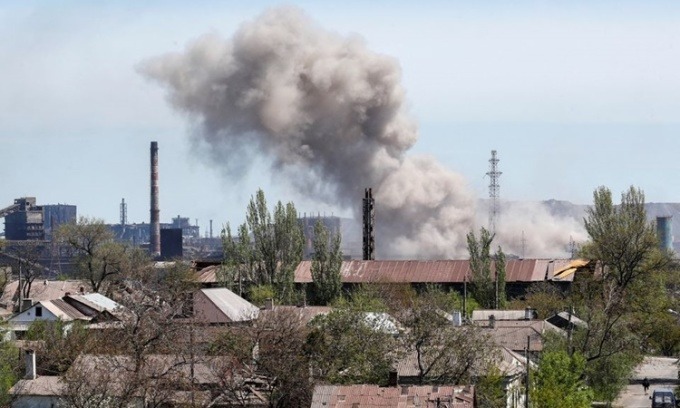 Khói bốc lên sau một vụ nổ ở nhà máy thép Azovstal ở Mariupol hôm 8/5. Ảnh: Reuters.