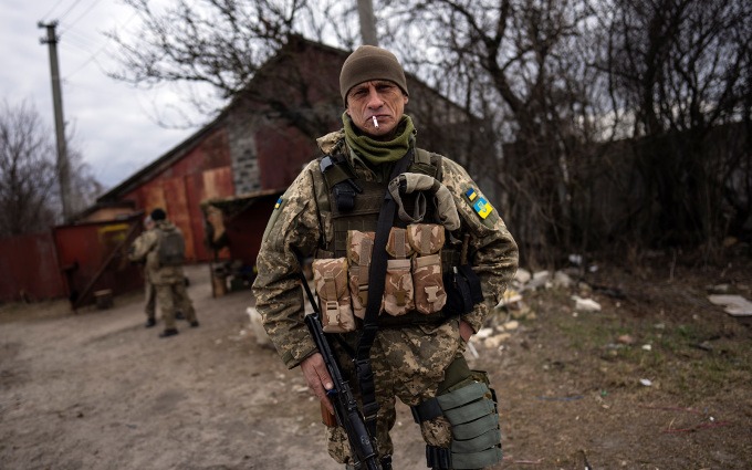 Lính Ukraine gần chiến tuyến Brovary, ngoại ô Kiev, Ukraine, ngày 28/3. Ảnh: AP.