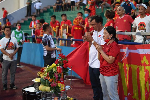Chị Hạnh cùng anh em cúng lễ trước trận đấu Việt Nam gặp Philippines (Ảnh: Phương Thảo)