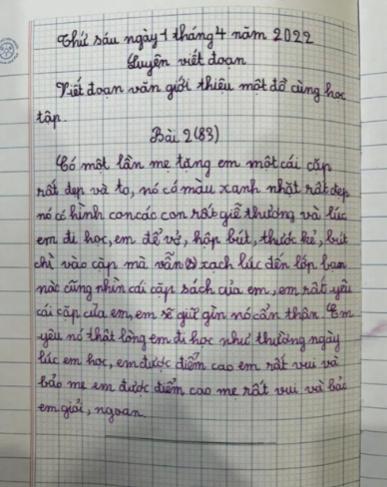 "Có lần mẹ tặng em một chiếc cặp sách rất đẹp và to, nó có màu xanh nhạt rất đẹp nó có hình các con rất 'giễ' thương và lúc em đi học, em để vở, hộp bút, thước kẻ, bút chì vào cặp mà vẫn 'xạch' lúc đến lớp bạn nào cũng nhìn cái cặp sách của em, em sẽ giữ gìn nó cẩn thận. Em yêu nó thật lòng em đi học như thường ngày lúc em học, em được điểm cao em rất vui và bảo mẹ em được điểm cao mẹ rất vui và bảo em giỏi, ngoan".