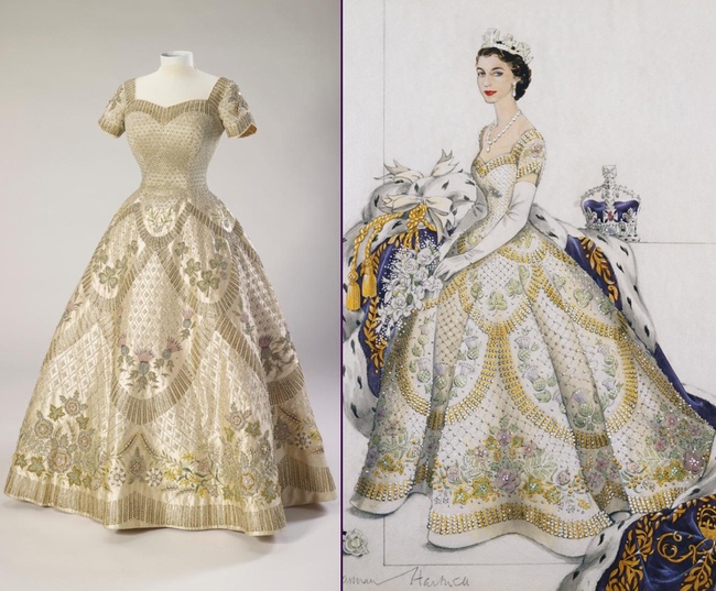Chiếc váy này do chính nhà thiết kế Norman Hartnell, người làm ra váy cưới của Nữ hoàng Anh, thực hiện. Được biết, vào tháng 10/1952, Nữ hoàng đã đề nghị Norman Hartnell tạo ra chiếc váy đăng quang cho mình.
