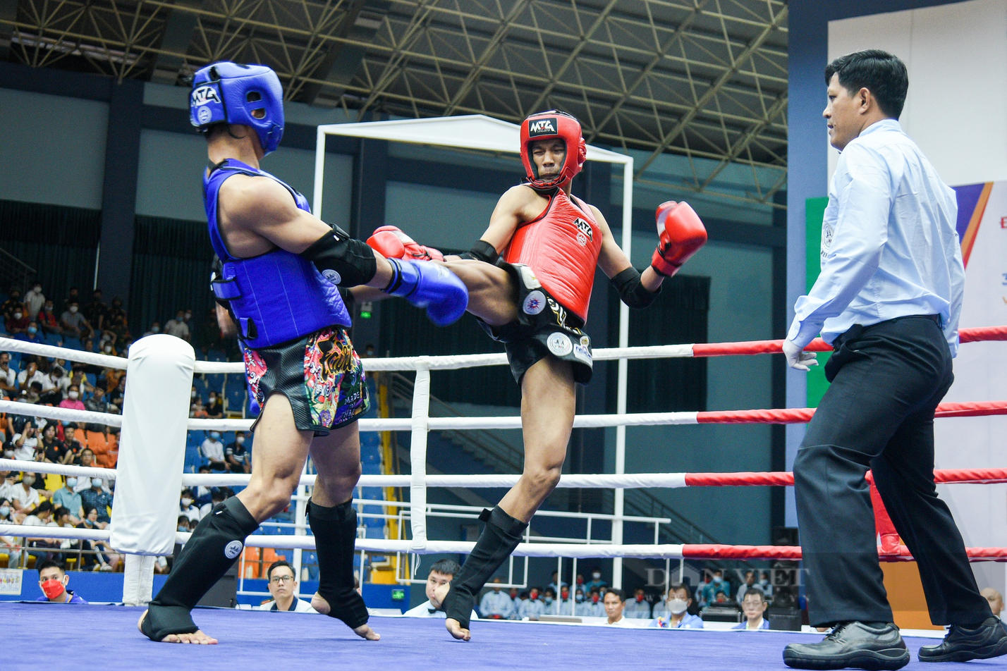 Võ sỹ Nguyễn Trần Duy Nhất tung ra những đòn sở trường đá vòng cầu, đánh cận chiến để ghi điểm.