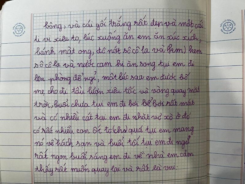 "Lúc ngày nghỉ em được bố mẹ cho đi 'hách' (khách) sạn lúc em vào trước mắt là có một căn phòng chứa những cái 'trăng' (chăn) gấp gọn 'gàn' (gàng), có gấu bông, và cái gối trắng rất đẹp và có một cái ti vi 'xiêu' (siêu) to, lúc xuống ăn em ăn xúc xích, bánh mật ong, 'đô nớt' (donut) sô cô la và kem sô cô la và nước cam ăn 'song' (xong) tụi em đi lên phòng ngủ, một lúc sau em được bố mẹ cho đi tàu lượn 'xiêu' (siêu) tốc và vòng quay mặt trời, buổi 'chưa' (trưa) tụi em đi bơi bể bơi rất mát và có nhiều cát tụi em đi nhặt vỏ 'xò' (sò) ở đó có rất nhiều con ốc to quá tụi em mang nó về 'hách' (khách) sạn và buổi tối tụi em đi ngủ rất ngon buổi sáng em đi về nhà em cảm thấy rất muốn quay lại và rất là vui".