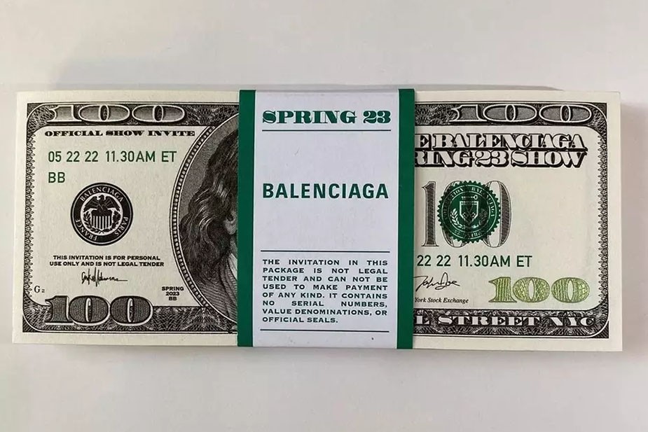 “BALENCIAGA DOLLARS” giống với tờ tiền một trăm đô la Mỹ với bức tranh tường và dấu ấn cổ điển của Benjamin Franklin. Tuy nhiên, khi kiểm tra kỹ hơn, các chỉ báo ngày và giờ cho buổi biểu diễn cũng như dòng chữ “Balenciaga Spring 23 Show” được in trên tờ tiền. Một tờ giấy bọc tiền màu xanh lá cây mang thương hiệu Balenciaga cung cấp một tuyên bố từ chối trách nhiệm và cho biết rằng thiệp mời bằng tiền mặt không chứa số sê-ri và không thể được sử dụng trong trao đổi mua bán và thiệp mời bằng tiền mặt gợi ý về địa điểm của buổi biểu diễn, dự kiến ​​diễn ra tại New York Tòa nhà Sở giao dịch chứng khoán. Như một điểm nhấn bổ sung, những đồng đô la được cho là đã được tẩm bởi một mùi đặc trưng riêng của nghệ sĩ và nhà nghiên cứu Sissel Tolaas.
