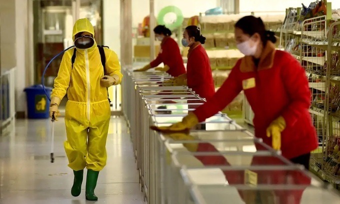 Nhân viên phun khử khuẩn và lau bề mặt tại một cửa hàng bách hóa trẻ em ở Bình Nhưỡng, Triều Tiên. Ảnh: AFP