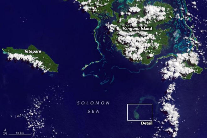 Hình ảnh vệ tinh được Đài quan sát Trái Đất của NASA công bố cho thấy một đám nước đổi màu thoát ra từ núi lửa ngầm Kavachi, nằm cách đảo Vangunu thuộc quần đảo Solomon khoảng 24 km về phía Nam.