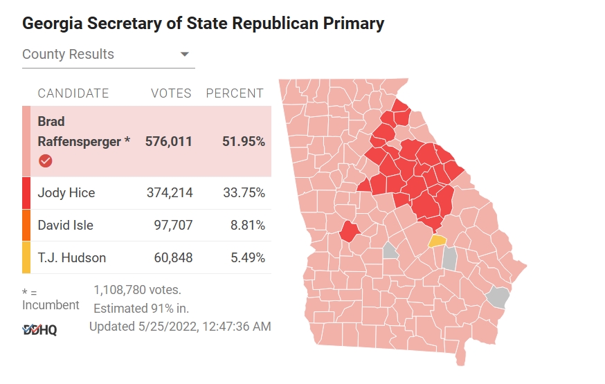 Secretary of State Brad Raffensperger — who refused to help former President Donald Trump overturn now-President Joe Biden's 2020 victory in Georgia and has defended the integrity of that election, won the Republican primary for another term.