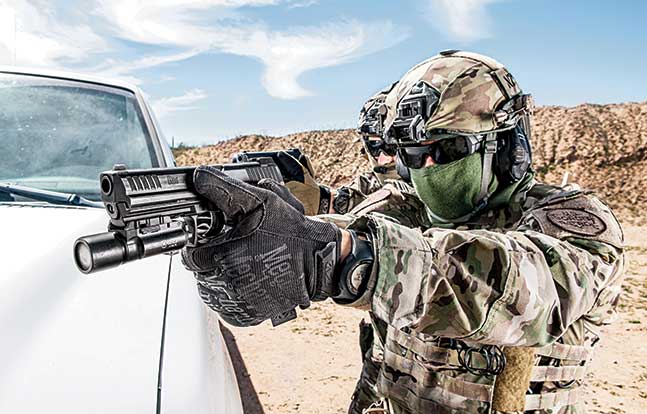 3 đặc vụ lái xe tới khuôn viên trường tiểu học, mặc áo giáp chống đạn, bước vào trường với các thiết bị chuyên dụng và súng trường.