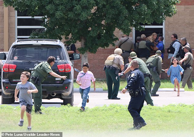 Học sinh chạy đến nơi an toàn sau khi thoát ra ngoài lớp học qua lối cửa sổ tại Trường tiểu học Robb, bang Texas, Mỹ ngày 24-5. Ảnh: Uvalde Leader News
