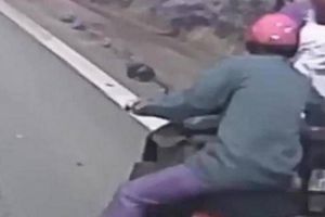 Trước tình huống nguy hiểm, một người đàn ông đi xe máy phía sau tăng ga đuổi theo trên đoạn đường dốc và dùng một tay kéo chiếc xe lại, cứu thành công cả gia đình.