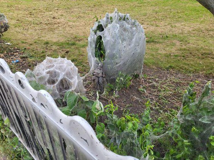 Sarah Longfellow, 34 tuổi, sinh sống ở Castleford, Tây Yorkshire, Anh choáng váng khi sáng ngủ dậy phát hiện những đám mạng lưới trắng xóa khổng lồ bao phủ nhiều cây cối, tường rào xung quanh nhà.