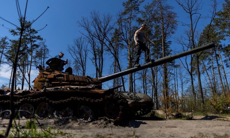 Người dân địa phương leo lên một chiếc xe tăng Nga bị phá hủy gần thành phố Irpin, phía bắc Ukraine, hôm 6/5. Ảnh: Reuters.