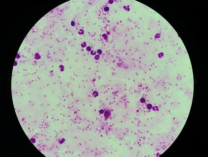 Hình ảnh ký sinh trùng sốt rét mật độ cao trong máu nữ bệnh nhân, với các chấm màu hồng tím là ký sinh trùng. Ảnh: Bác sĩ cung cấp