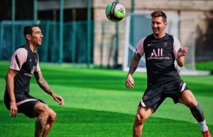 Di Maria (trái) trong một buổi tập cùng Messi ở PSG mùa vừa qua. Ảnh: psg.fr