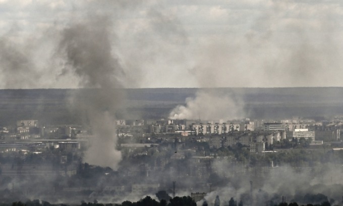Khói bốc lên sau các cuộc pháo kích ở thành phố Severodonetsk, Donbass, miền đông Ukraine, hôm 7/6. Ảnh: AFP.