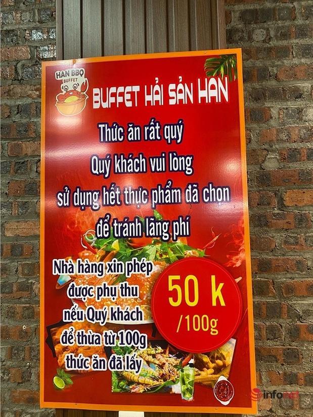 Vì thế, cứ mỗi 2 mét trên tường của quán đều có dán thông báo với nội dung: "Thức ăn rất quý, quý khách vui lòng sử dụng hết thực phẩm đã chọn để tránh lãng phí. Nhà hàng xin phép được phụ thu nếu quý khách để thừa từ 100gr thức ăn đã lấy", và mức giá là 50.000đ cho 100gr thức ăn thừa.