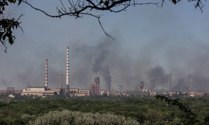 Khói đen bốc lên từ khu vực nhà máy hóa chất Azot ở thành phố Severodonetsk, thuộc tỉnh Lugansk hôm 10/6. Ảnh: Reuters.