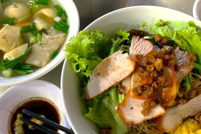 Hủ tiếu trứng cuộn khá thu hút giới trẻ Sài Gòn bởi cách chế biến độc lạ. Điểm đặc biệt nhất của món ăn là trứng cuộn (trứng đánh đều, nêm gia vị rồi cho vào ruột heo), luộc chín trong nồi nước lèo sau đó cắt lát mỏng. Trứng cuộn ăn mềm, có độ giòn sật dễ ghiền. Thông thường khách hay gọi hủ tiếu khô trộn với sốt đậm gia vị, có thịt xá xíu và hoành thánh chiên giòn, kèm chén nước súp có trứng cuộn riêng. Ảnh: Instagram quicksand